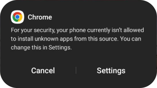 Click “Settings” in a message stating that installation of applications from unknown sources is not allowed.